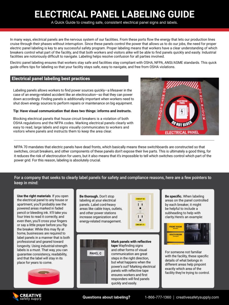 The design of specific electrical panel labels will depend primarily on regulatory requirements, equipment specifications, durability needs, and materials of construction. With these tools, floor marking for electrical panel compliance can be accomplished without spending too much time or effort. Periodic review of existing ocpd settings is a good idea to maintain a safe electrical system. Placing floor markings around that perimeter is an effective way to help stay in compliance with those requirements. Nfpa (national fire protection association) 79 is a section of the nec that pertains to wiring standards for industrial machinery.